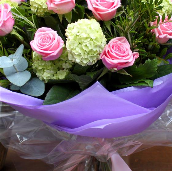 An unusual twist on the classic dozen roses. Pale lime green viburnum combines beautifully with 12 long stemmed pink roses and deep green foliage.