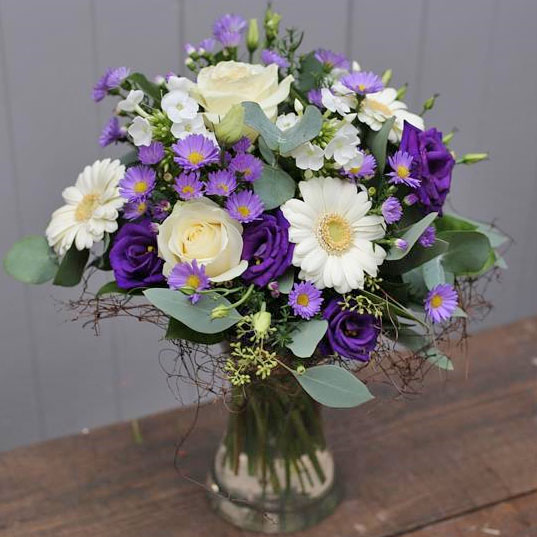 A sweet hand tied posy in shades of creams and purples including roses, mini gerberas, lisianthus and september flower presented in a glass vase.