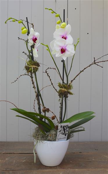 A beautiful, large, double stemmed orchid in a ceramic pot. Please pick the colour you would like.