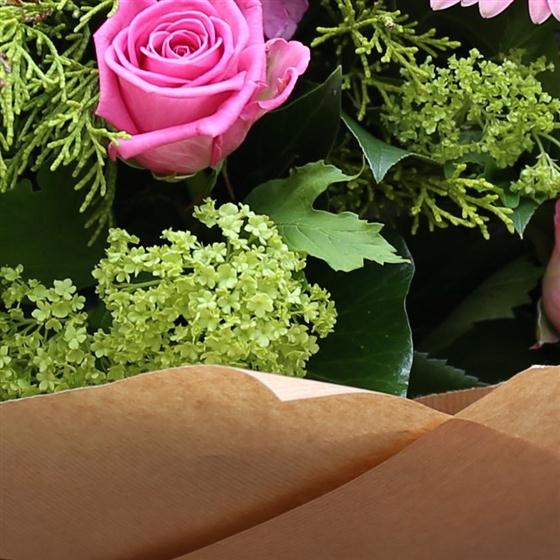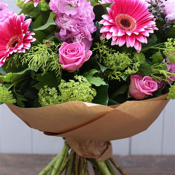 Mixed pinks and greens create this country garden style classic bouquet.
