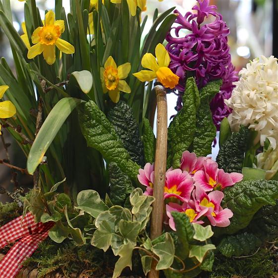 A delightful selection of spring plants including primula, scented hyacinths and narcissus.