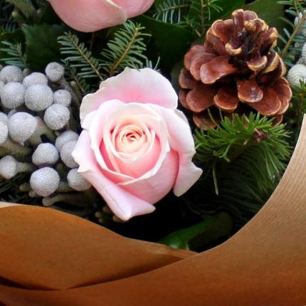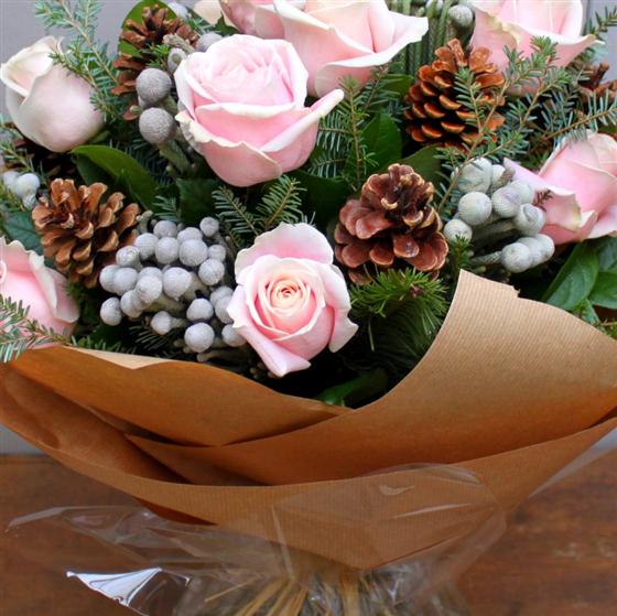 Vintage style pink roses, brunia, sugar pine and pine cones make up this winter hand tied.