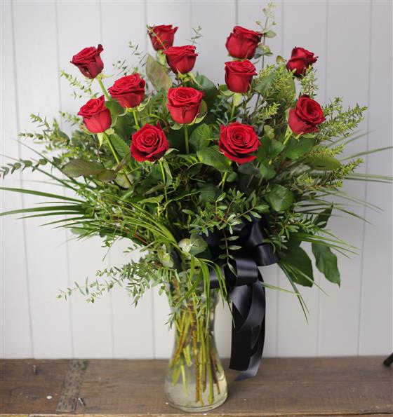 A dozen beautiful fresh Red Roses, the best large headed long stemmed roses the flower markets offer hand tied with seasonal foliages.